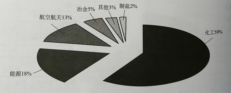 鈦合金的應用領域廣泛。圖1-2顯示了20世紀北美、西歐鈦在各領域的使用量,其中民用航空領域鈦的使用量 最大,占33%,其次為化工、能源、軍工和體育用品,少量的部分用于PHE、脫鹽工業和裝甲等。