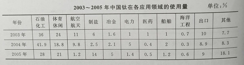 2002年鈦在中國各領域中的使用量,一半以上的鈦用于化工領域,其次為能源和航空航天領域,分別為18%和 13%,與圖1-1中數據相比可以發現,北美、西歐鈦的主要使用領域是民用航空,而中國由于民用航空制造業比較 薄弱,因此在此領域鈦的使用量較少。2003~2005年鈦應用領域用量。