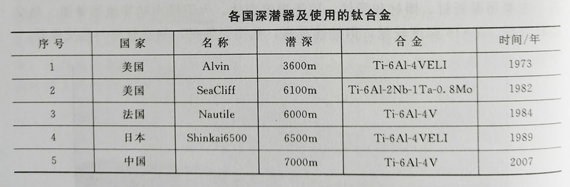 列出了各國發(fā)展的深潛器及使用的鈦合金