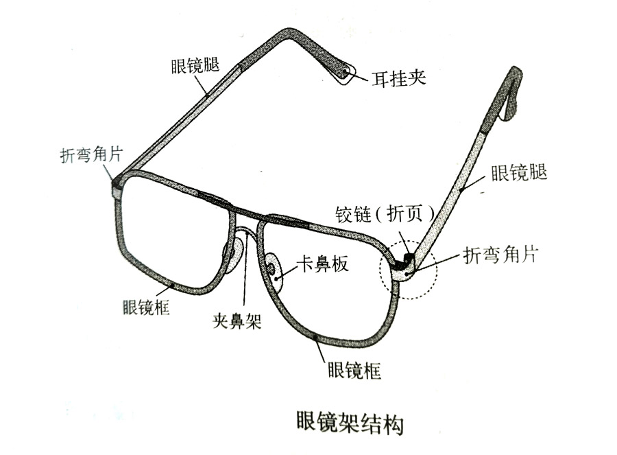 鈦制眼鏡架出現在市場上是20世紀80年代初期,目前作為金屬制原材料,它已占據了牢固而不動搖的地位。這是由于鈦具備了比強度高(質輕而堅韌)、耐腐蝕性優良、生物相容性很好等優點而形成的,下圖為眼鏡架結構。眼鏡架的部件加工技術如下。