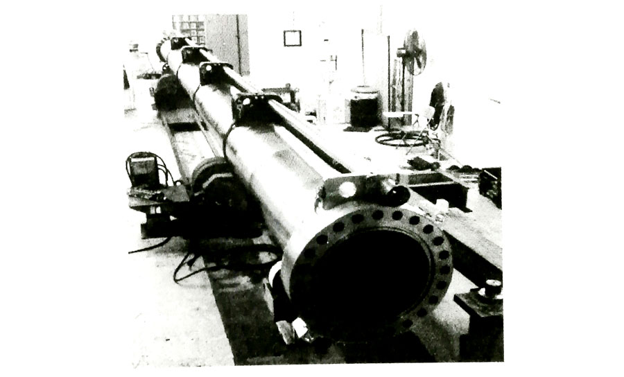 英國北海油田上應(yīng)用的鈦合金隔水管是用Ti-6Al-4VELI(Grade23) 鈦合金制成的超大型高壓管,由30根Φ599mm(內(nèi)徑)×25mm(壁厚)X14.6m(長)巨型鈦合金管連接而成, 總長438m, 其產(chǎn)品實物照片見圖2, 該隔水管由美國RMI公司制造。用鈦管代替鋼管,可降低提升力63%,降低制造成本40%,它適用于350m水深油田的采油。