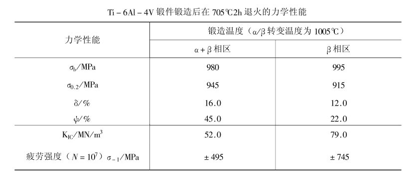 a+β鈦合金的力學性能與組織間的關系也較復雜。合金的抗拉強度對退火組織和鍛造溫度不甚敏感,見下表。