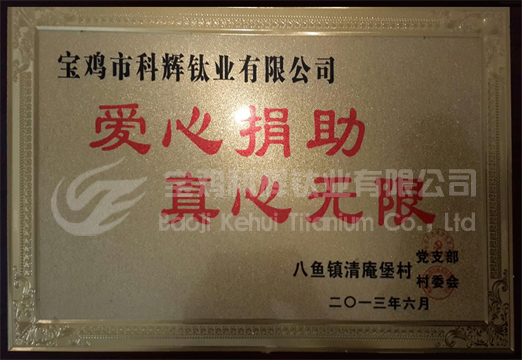 寶雞市科輝鈦業(yè)有限公司,自創(chuàng)建以來(lái),多次參與清庵堡村的失學(xué)兒童、孤寡老人愛(ài)心奉獻(xiàn)活動(dòng),公司以幫助他人 ,快樂(lè)自己 ,努力開(kāi)拓的企業(yè)文化,于工業(yè)園區(qū)建立長(zhǎng)期合作關(guān)系,深受清庵堡村黨支部領(lǐng)導(dǎo)關(guān)懷。2013年6月,獲得清庵堡村委會(huì)“愛(ài)心捐助 真心無(wú)限”榮譽(yù)稱號(hào),公司將以此為契機(jī),繼續(xù)開(kāi)展愛(ài)心活動(dòng),做一個(gè)有責(zé)任的企業(yè)。