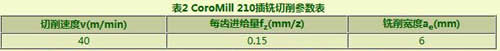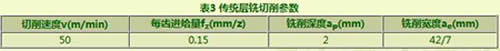 傳統(tǒng)層銑選用可樂滿CoroMill390(刀具直徑42mm,主偏角90°)銑刀,切削速度50m/min,每齒進(jìn)給量0.15mm/z。為避免刀具受徑向力過大產(chǎn)生切削振動,切削深度不宜過大,推薦值為2mm;槽寬為49mm,顯然層銑加工開槽首刀為滿切寬銑削,即42mm;第2刀銑削寬度為剩余的7mm。層銑開槽的切削參數(shù)如表3所示。