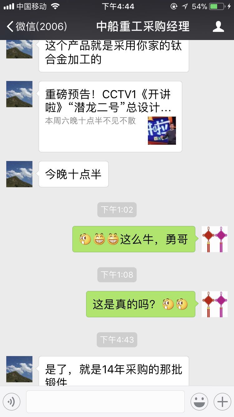 近日,科輝鈦業(yè)從終端客戶了解到,我公司鈦及鈦合金材料 ,應(yīng)用到“潛龍二號”,鈦合金因具有強度高、耐蝕性好、耐熱性 高,在深海作業(yè)、化工設(shè)備、航空等領(lǐng)域應(yīng)用廣泛。科輝鈦業(yè)鈦合 金在“潛龍二號”的應(yīng)用,是我們不斷深入國際鈦市場的最前沿領(lǐng) 域,深入研究鈦材的新技術(shù)、新工藝和新興市場,求真務(wù)實的結(jié)果 。公司將以此為契機,不斷創(chuàng)新進取,研發(fā)更高質(zhì)量的鈦合金材料 。