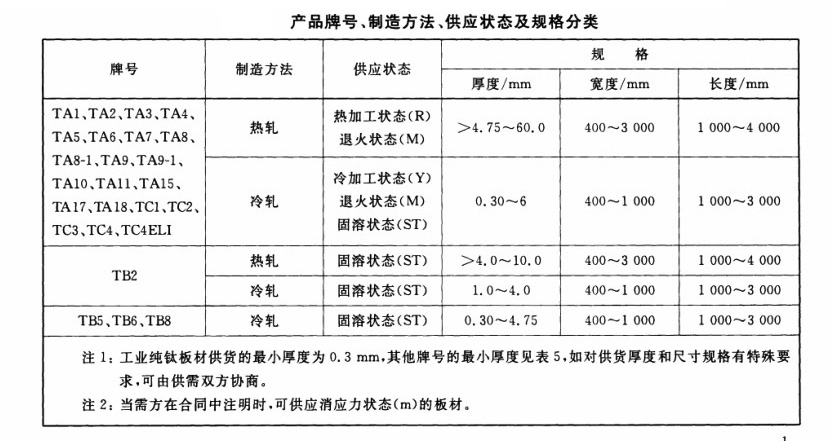 鈦板執(zhí)行標準有兩類,國標是GB/T3621-2007、GB/T13810-2007,美標是ASTM B265、ASTM F136、ASTM F67、AMS4928。針對鈦合金板的GB/T3621-2007標準,從板材的要求、試驗方法、檢驗規(guī)則及標志、包裝、運輸、貯存及合同內容等方面,進行了詳細的規(guī)范,以下主要分享鈦合金板(GB/T3621-2007)的牌號、制造方法、供應狀態(tài)及規(guī)格等。