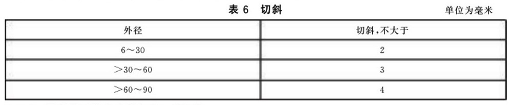 3.3.4 管材兩端應(yīng)切平整,不應(yīng)有毛刺,切斜應(yīng)符合表6的規(guī)定。