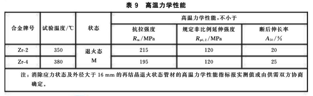 3.4.2 需方要求并在合同中注明時,Zr-2和Zr-4管材可進行高溫力學(xué)性能檢驗。外徑不大于16mm管材的高溫力學(xué)性能應(yīng)符合表9的規(guī)定。