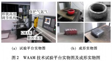 WAAM主要包括熔化極惰性氣體保護(hù)焊(Metalinert gas welding,MIG)、鎢極惰性氣體保護(hù)焊(Tung—sten inert gas welding,TIG)、等離子弧(Plasma arc,PA)、冷金屬過(guò)渡(Cold metal transfer,CMT)技術(shù)四種方式,TIG電弧增材制造技術(shù)是在鎢極氬弧焊接方法的基礎(chǔ)上改良而形成的一種技術(shù),主要的研究對(duì)象有鋁合金、鈦合金、不銹鋼;MIG電弧增材制造技術(shù)主要采用直接熔絲的方法進(jìn)行堆焊,此項(xiàng)技術(shù)大多數(shù)主要研究其成形工藝和力學(xué)性能,主要研究對(duì)象有鋁合金、鈦合金;PA電弧增材制造技術(shù)是一種高效率的焊接熱源;CMT技術(shù)則是一種全新的冷金屬過(guò)渡技術(shù),其優(yōu)點(diǎn)為熱輸入低,可以避免熔滴穿透,有利于熔滴過(guò)渡和良好的冶金連接。圖2為華中科技大學(xué)電弧增材制造技術(shù)的試驗(yàn)平臺(tái)實(shí)物圖及成形實(shí)物圖。