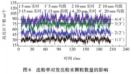 楊義成等人舊引以同軸送粉過(guò)程中粉末顆粒和激光發(fā)生相互作用過(guò)程為研究對(duì)象借助高分辨率攝像機(jī),結(jié)合圖像二值化處理方法,分析不同工藝參數(shù)該過(guò)程的影響規(guī)律如圖6所示,得出結(jié)論:隨著激光功率增加、送粉速率提高,粉末顆粒被激光輻照的面積和數(shù)量均呈逐漸增加趨勢(shì)。而離焦量提高、載氣流量增加則會(huì)使激光輻照總面積逐漸降低。