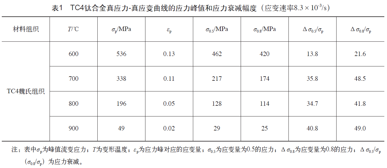 有報(bào)道對(duì)魏氏組織的TC4鈦合金變形溫度與變形應(yīng)力之間的關(guān)系進(jìn)行研究,結(jié)果顯示[5],當(dāng)變形時(shí)選擇的溫度從600℃升高到900℃時(shí)(應(yīng)變速率為8.3×10-3/s),流變應(yīng)力峰所對(duì)應(yīng)的應(yīng)變量εp從0.13減小到0.02,流變應(yīng)力峰值σp由536MPa下降到49MPa;在此溫度區(qū)間,溫度每升高100℃,應(yīng)力峰值分別下降36.9%、42%和75%,說明隨著變形溫度升高,材料的加工硬化能力顯著減弱,熱變形抗力減小的速度加快。該文獻(xiàn)同時(shí)指出,材料在600℃變形時(shí),不發(fā)生動(dòng)態(tài)再結(jié)晶,材料發(fā)生軟化的機(jī)制是動(dòng)態(tài)恢復(fù)。而在700℃下,變形應(yīng)力衰減的幅度相對(duì)600℃和800℃更大,并接近900℃應(yīng)力衰減的幅度。由此推斷,在700℃附近變形時(shí),可能發(fā)生了動(dòng)態(tài)再結(jié)晶,從而導(dǎo)致流變應(yīng)力隨應(yīng)變衰減的幅度急劇增大。各溫度下的變形情況見表1 [5]。
