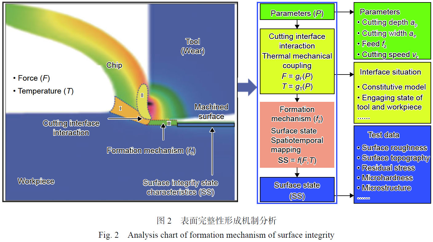 表面完整性形成機(jī)制就是描述給定切削工藝因子與切削加工過程中的切削力和溫度,及最終產(chǎn)生的表面完整性狀態(tài)特征之間的關(guān)系及其影響機(jī)制。如圖2 所示,表面完整性形成過程主要包括兩個階段:第一階段為不同工藝因子下,產(chǎn)生不同的切削力F = gF(P)和切削溫度T = gT(P);第二階段為不同熱力耦合作用下產(chǎn)生不同的表面完整性狀態(tài)特征SS = f(F,T)。在表面完整性形成過程中,切削界面熱力耦合作用不僅受工藝參數(shù)、刀具條件、潤滑方式的影響,還受材料性能、刀具-工件嚙合狀態(tài)、輸出響應(yīng)信號監(jiān)測等界面復(fù)雜工況的影響。切削加工過程中的熱力耦合作用使得材料分別在變形區(qū)Ⅰ、Ⅱ、Ⅲ內(nèi)產(chǎn)生應(yīng)力、應(yīng)變,從而使工件表層及亞表層組織、成分、力學(xué)性能發(fā)生變化,未得到釋放的切削力和切削溫度轉(zhuǎn)變?yōu)樽冃文苁构ぜ砻娈a(chǎn)生大塑性變形,同時(shí)伴隨著工件表面不均勻的應(yīng)力和變形,構(gòu)成了殘余變形區(qū),殘余變形區(qū)的變形儲存能是加工表面微觀組織、加工硬化、殘余應(yīng)力形成的能量來源。