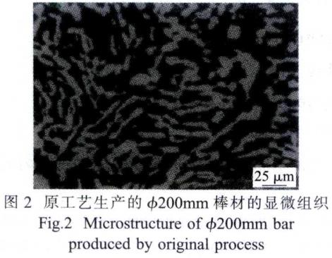 原常規(guī)鍛造工藝生產(chǎn)φ200mm棒材的顯微組織見圖2、可以看出,組織均勻性較差,具有一定的方向性。