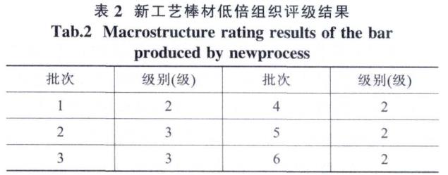 原常規(guī)鍛造工藝生產(chǎn)φ200mm的棒材的低倍組織按GJB2744A-2007圖1評級為3~5級,新工藝低倍組織評級見表2。