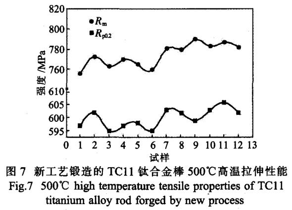 由圖7可見,高溫抗拉強度755~790MPa,屈服強度595~605MPa,均比原工藝高,性能差異性小,從而說明組織均勻性好。