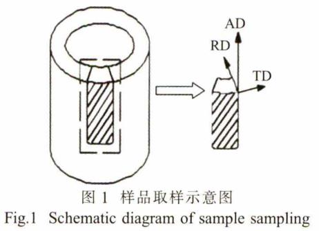 為了進行力學(xué)性能、微觀組織、氫化物測試,對成品φ126mm×3mm管材取樣,取樣示意圖如圖1所示。其中,AD、RD和TD分別是管材的軸向、徑向和切向。按照ASTME8/E8M《金屬材料拉伸試驗方法》在AG-X100kN型電子萬能材料拉伸試驗機上開展管材軸向室溫拉伸試驗,按照ASTME21《金屬材料高溫拉伸試驗方法》在WDW-50型微控電子萬能試驗機上開展管材軸向高溫(315℃)拉伸試驗。利用LEICA-DM2500M型金相顯微鏡觀察管材橫截面(RD-TD)的晶粒組織、氫化物分布,晶粒度評級按照ASTME112《測定平均晶粒度的試驗方法》,氫化物取向因子(