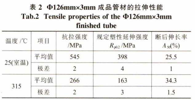 表2為不同批次成品管材多個試樣拉伸性能。由表2看出不同批次成品管材室溫、315°C高溫的抗拉強度、規(guī)定塑性延伸強度/R0.2、斷后伸長率數(shù)據(jù)波動小,質(zhì)量穩(wěn)定。φ126mm×3mm成品管材室溫抗拉強度達545MPa,相對標(biāo)準(zhǔn)偏差為0.21%;規(guī)定塑性延伸強度Rp0.2達到398MPa,相對標(biāo)準(zhǔn)偏差為0.50%。材料室溫強度滿足核反應(yīng)堆設(shè)計抗拉強度≥450MPa、規(guī)定塑性延伸強度≥310MPa的要求[5-7],而且材料斷后伸長率達到25.5%,相對標(biāo)準(zhǔn)偏差為1.96%,表明材料塑韌性較好。φ126mm×3mm成品管材315°C高溫抗拉強度