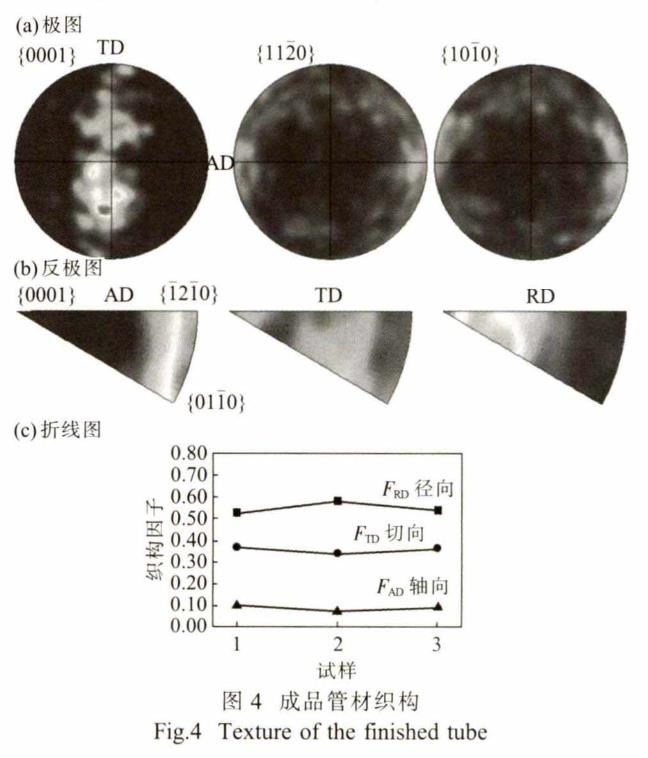 圖4為φ126mm×3mm成品管材的織構(gòu)。采用EBSD分別測量成品管材徑向RD、切向TD、軸向AD三個方向的織構(gòu)因子。由極圖、反極圖、折線圖可以看出,成品管材大多數(shù)晶粒的取向以徑向取向為主,徑向織構(gòu)因子最大達0.55,這樣有利于管材氫化物沿管材周向分布。鋯合金在核電站核島服役過程中,冷卻水中的氧會與鋯材料反應(yīng),由此產(chǎn)生的氫以及因為水化學(xué)控制所存在的氫都會在某種程度上被鋯合金吸收[10]。鋯合金吸氫后,長期在應(yīng)力作用下可能造成延遲氫脆,是影響反應(yīng)堆安全的主要因素之一。鋯合金管中,切向取向的氫化物與徑向基極的織構(gòu)相對應(yīng)。當(dāng)鋯合金管材的[0002]基軸主要取向徑向時,氫化物主要平行于包殼管表面分布。這種分布可防止包殼在使用過程中發(fā)生氫脆。