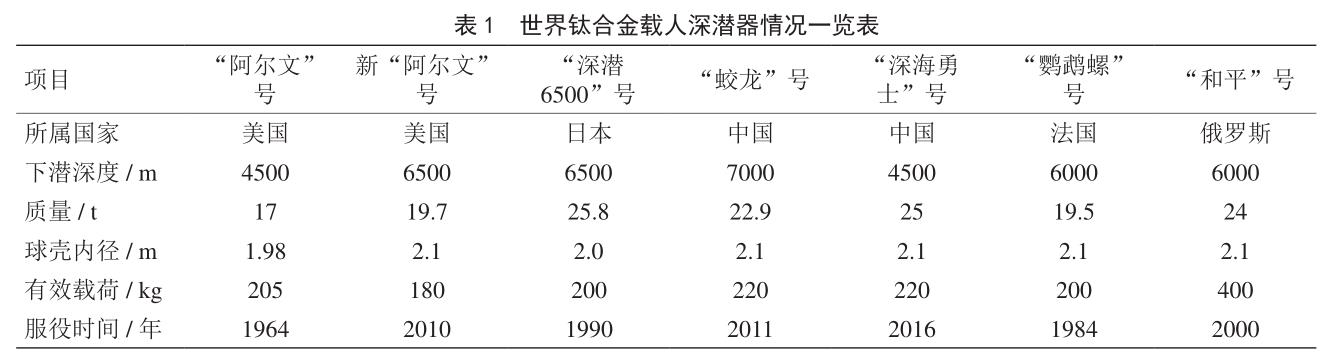 世界鈦合金載人深潛器發(fā)展情況見表 1。