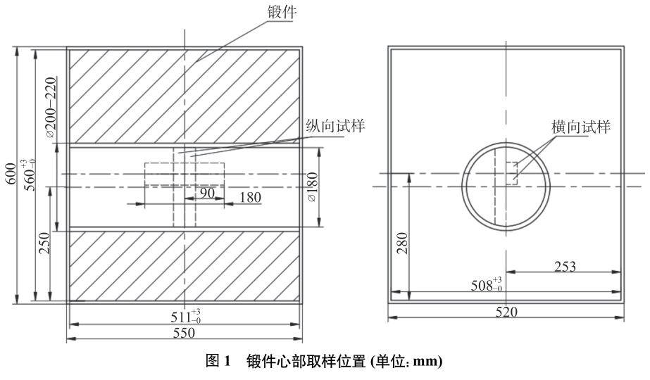 鍛件采用符合AMS2750E要求的四級爐(爐溫均勻性±14°C)進行加熱及熱處理,在45MN快鍛機上鍛造,鑄錠經(jīng)由相變點上鐓拔開坯,然后進行相變點下多火次鐓粗—拔長鍛造,變形速度60mm/s,每次鐓粗變形量分別為30%、40%、50%,終鍛溫度控制在650~700°C,鍛后坯料經(jīng)600°C保溫3h,空冷后,分別從方坯的最心部切取橫縱向拉伸及顯微組織試樣,取樣位置見圖1,經(jīng)數(shù)控車床按ASTME8要求加工成ϕ12.5mm的標(biāo)準(zhǔn)拉伸試樣,采用CMT5205電子拉伸試驗機測定拉伸性能,采用舜宇光學(xué)ICX41M倒置式金相顯微鏡觀察顯微組織。