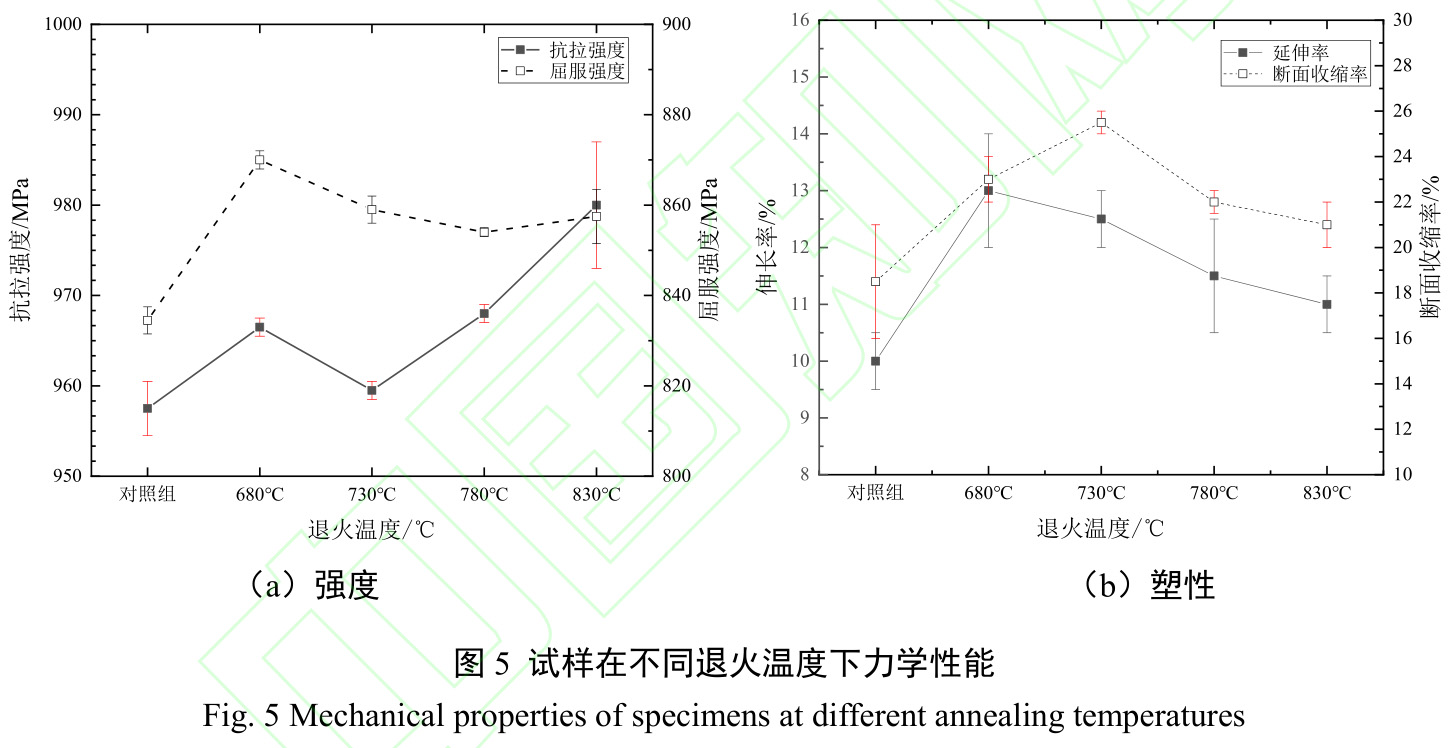 結合內部組織的變化以及圖5可知,高氧TC4鈦合金在退火溫度為780℃時,晶粒細化程度最高,且相轉變程度較低,同時原始結構中寬大的集束片層被截斷,兩相片層組織分布均勻的同時取向隨機,板條狀組織清晰可見,且少見相界面模糊區域,因此位錯經過時需要更大的力。同時在拉伸過程中,寬大的集束片層被截斷,且兩相片層組織分布均勻,能夠有效的提高塑性。因此,經780℃退火后的高氧TC4鈦合金既具有相對較高的強度,同時塑性下降程度較小,綜合力學性能最優。