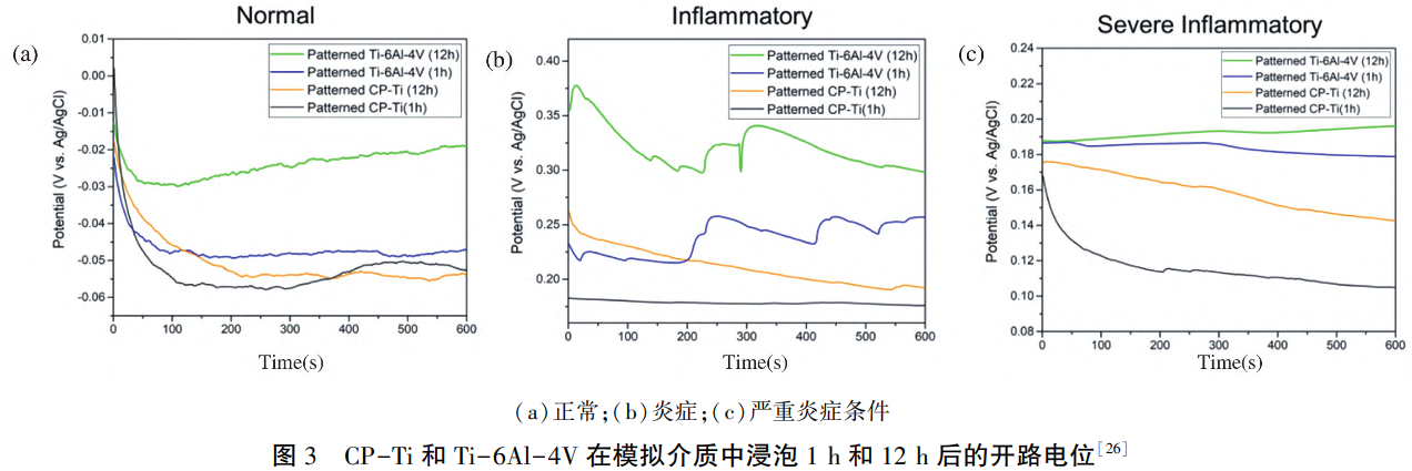 鈦合金的生物相容性是作為人體植入材料需要考察的一項重要內容,生物材料表面在局部條件下的電 化學行為是影響植入成功與否的重要因素。Aydin等[26]研究了增材制造鈦合金在模擬正常、炎癥 和嚴重炎癥條件的三種不同介質中浸泡1h和12h后的電化學行為。極化研究表明,在所有情況下 ,耐腐蝕性都會隨著浸泡時間的延長而增加。研究發現,在炎癥條件下,H2O2會對被動層的電阻產生 破壞作用,而在嚴重炎癥條件下,白蛋白、乳酸鹽和H2O2都會協同降低鈦層 的耐腐蝕性。電化學阻抗數據表明,在嚴重炎癥條件下,帶電的白蛋白會吸引到局部點蝕區域,從而改 變腐蝕性物質在金屬/被動層界面的擴散傳輸。