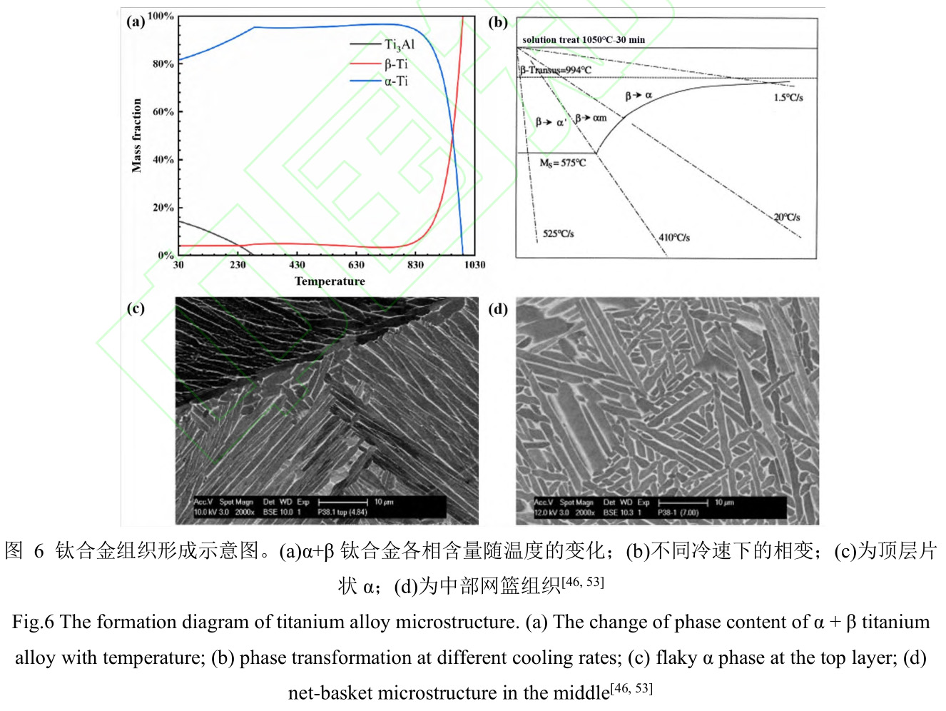 對于工業上應用最多的(α+β)型鈦合金,其組織演變過程一般如下[52]:沉積層凝固時,內部首先發生液相→β相的相變。隨著溫度持續降低,β相穩定元素擴散系數較大而使得原始β晶粒不斷長大,并將晶內的α相穩定元素持續排到晶界處。一旦溫度降低至α+β兩相區時,將發生β→α轉變。由于β晶界處富集了α相穩定元素,導致α相在β相晶界上形核,并沿晶界形成連續的α相層,即晶界α相。當冷卻速率較慢時,晶界α相會逐漸在β晶粒內部形成平行的片狀α相,并與其它的片狀α相交織從而停止進一步生長。如圖6所示為(α+β)鈦合金冷卻時的相變化曲線以及WLMD鈦合金典型組織形貌,合金在冷卻速度較高時內部基本為馬氏體結構,但隨著冷卻速度降低到410℃/s以下時,魏氏體會逐漸代替馬氏體結構[46,53,54]。