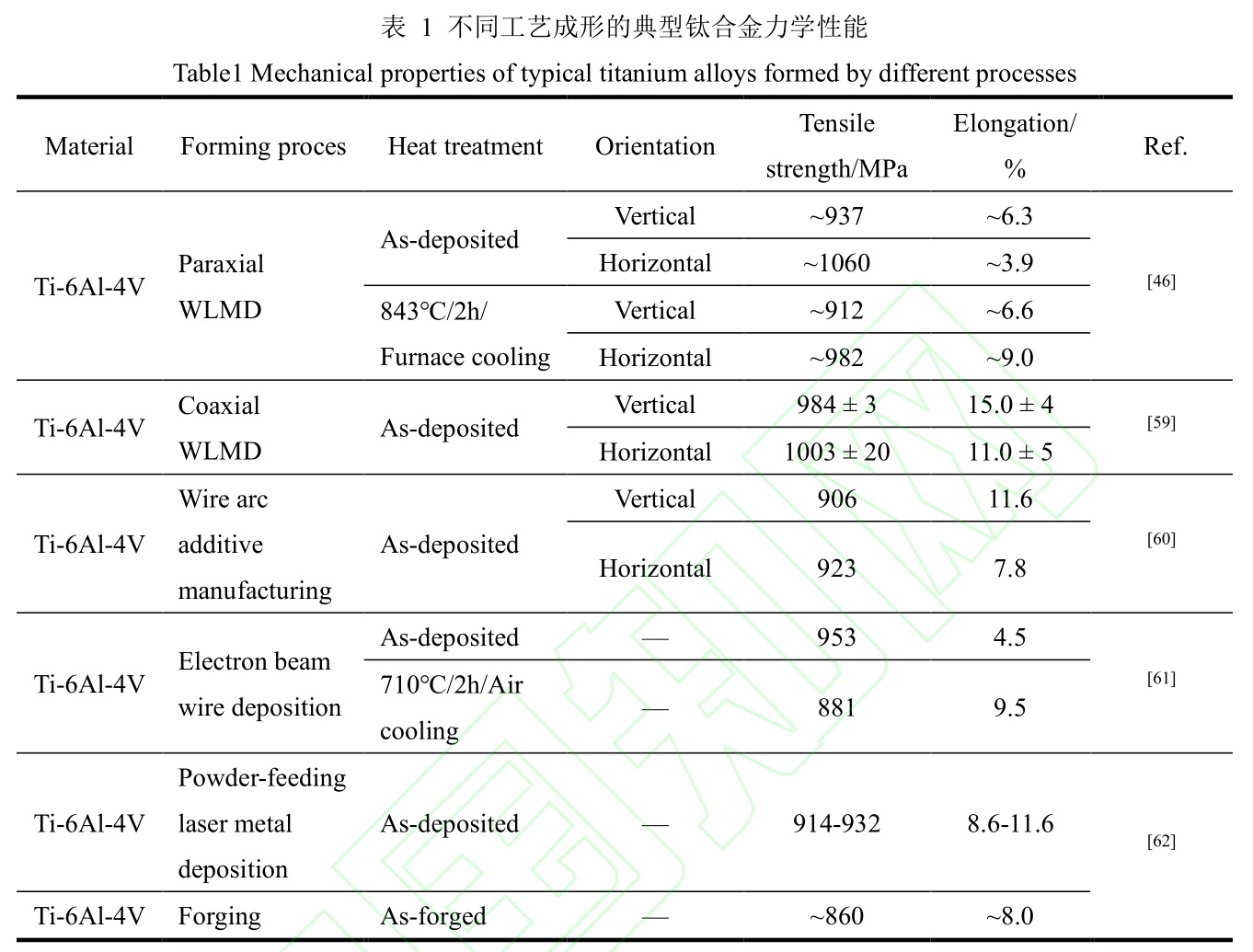 由于WLMD鈦合金內部組織分布不均而使各個位置力學性能出現差異。通常試樣硬度受沉積工藝參數的影響較小,而拉伸性能則在垂直和平行基板的方向上表現出較大差別,主要在于垂直方向的延伸率優于平行方向。這是因為平行方向有著更多的β柱狀晶界,晶界處的α相在載荷作用下會提前失效。沉積工藝參數會對熔池熱輸入產生重要影響,進而形成不同的組織形貌,并對沉積試樣的性能產生關鍵作用。因此,利用沉積過程中以及沉積完成后的各種工藝手段對組織進行優化,有助于獲得較好性能的合金,對此已有大量組織性能調控相關的研究[58]。表1為不同成形技術所制備鈦合金力學性能的對比,可見,送絲增材制造鈦合金構件的力學性能受控于工藝,因而高性能構件的增材制造需要建立材料-工藝-組織-性能的一體化設計、制造與調控理論及方法。