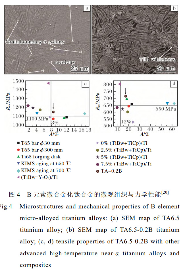 除了Al元素外,其他α穩(wěn)定元素(如C、O和N等)也對鈦合金的組織性能有著重要影響。呂智丹等人[19]系統(tǒng)探討了近β鈦合金Ti-4Al-5Mo-8V-2.5Cr1Sn-2Zr中添加C元素對微觀組織和力學性能的影響。圖3為Ti-4Al-5Mo-8V-2.5Cr-1Sn-2Zr合金中加入不同含量C元素后的XRD譜圖和維氏硬度。由圖3a可知,添加C元素會生成TiC相。TiC相能夠釘扎晶界,抑制晶粒生長,并充當α相析出的形核點。隨著C含量的增加,α相異質(zhì)形核點數(shù)量增多,α片層的取向更加隨機,形成網(wǎng)籃組織,同時β晶粒得到細化。如圖3b所示,隨著C元素添加量的增加,合金的顯微硬度逐步提高。與以往鈦合金中添加C元素的研究相比,該研究深入分析了C元素對近β鈦合金微觀組織和力學性能的具體影響,特別是TiC相對晶粒細化和相變行為的作用,為進一步優(yōu)化鈦合金的力學性能提供了新的見解和方向。Ma等人[20]研究了微量B元素添加對鈦合金組織和性能的影響。該研究通過感應熔煉法制備了TA6.5和TA6.5-0.2B鈦合金,詳細分析了B元素添加后合金在顯微組織、織構(gòu)、力學性能和斷裂行為上的顯著變化。圖4為B元素微合金化鈦合金的微觀組織與力學性能。從圖4可見,B元素的加入顯著細化了初生β晶粒和α團簇,使合金的顯微組織從魏氏組織轉(zhuǎn)變?yōu)榫W(wǎng)籃組織,并改善了組織的均勻性,同時降低了α相的織構(gòu)強度。這些微觀結(jié)構(gòu)的變化促進了動態(tài)再結(jié)晶行為,從而增強了合金在室溫和高溫(650℃)下的綜合力學性能。特別是TiB晶須的形成,使高溫拉伸時的斷裂模式由解理斷裂轉(zhuǎn)變?yōu)轫g性斷裂。此外,B元素的添加還會影響孔洞的生成位置,為分析合金的斷裂機理提供了新的見解。這項研究不僅深入分析了微量元素對鈦合金性能的影響,還為鈦合金的應用和設(shè)計提供了重要的參考依據(jù)。