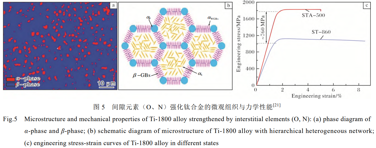 雖然雜質(zhì)元素(如O、N)會顯著降低鈦合金的延展性,甚至引起脆化,但能夠提高合金的強度。近年來,國內(nèi)外學者開始拓展思路,探索使用間隙原子O、N來制備具有超高比強度、低成本、高韌性的鈦合金。Zhang等人[21]通過引入間隙元素O、N設(shè)計了Ti-1800合金(Ti-4.1Al-2.5Zr-2.5Cr-6.8Mo-0.17O-0.10N)。圖5為間隙元素(O、N)強化Ti-1800合金的微觀組織與力學性能。通過析出微米級初級α、納米級次級α和超細α-Widmanstätten納米沉淀于β基體,使Ti-1800合金的屈服強度達到1800MPa(圖5c)。在晶界工程(GBE)的作用下,納米沉淀網(wǎng)絡直接從β晶界(GBs)中析出,增強了晶界的內(nèi)聚力,有效減緩了裂紋尖端的應力集中并阻止裂紋擴展,從而提升了合金的延展性。采用860℃固溶處理(ST-860)和500℃時效處理(STA-500)工藝,通過析出納米級α層和α板,實現(xiàn)了合金的進一步強化。從力學角度分析,富含α晶界的連續(xù)α穩(wěn)定劑(O、N元素)的強度低于沉淀硬化的β基體,導致α晶界與轉(zhuǎn)化后的β基體之間存在強度不匹配,產(chǎn)生顯著的應變不相容性,從而引發(fā)晶間斷裂和裂紋分散。此研究采用了間隙溶質(zhì)與晶界工程相結(jié)合的合金設(shè)計策略,不僅實現(xiàn)了鈦合金強度和延展性的同步提升,還增強了其對間隙雜質(zhì)的耐受性,為鈦合金性能優(yōu)化提供了創(chuàng)新性途徑。