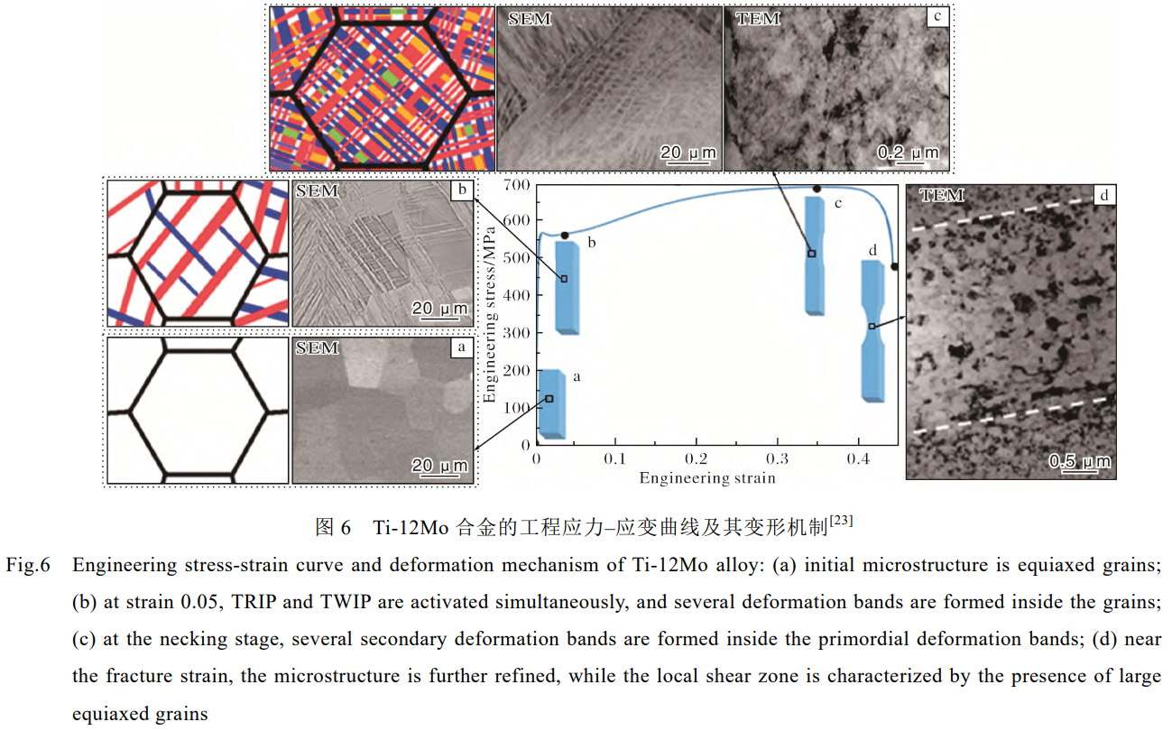 在鈦合金的研究中,同晶型β穩(wěn)定元素(如Mo、Ta、V等)通過抑制α相的析出,促進β相的形成和穩(wěn)定,從而提升鈦合金的塑性和韌性。同時,這些元素還可以通過溶質(zhì)原子效應和固溶強化機制,細化β相晶粒,提高合金的抗變形能力。目前的研究主要集中于不同含量的同晶型β穩(wěn)定元素對鈦合金微觀組織、相變行為和力學性能的影響規(guī)律,以及這些元素在β鈦基體中的固溶度和擴散行為。Zhang等人[22]在Ti-5Al-5Mo-5V-3Cr(Ti-5553)合金中添加了10%(質(zhì)量分數(shù))的Mo元素,并通過激光粉末床熔化技術(shù)(L-PBF)制備了相關(guān)合金。研究表明,Mo元素的添加實現(xiàn)了雙重優(yōu)化效果。首先,未完全溶解的Mo顆粒在凝固過程中作為異質(zhì)成核位點,促進了新晶粒的形成,而溶解的Mo溶質(zhì)則創(chuàng)建了過冷區(qū),從而提高了晶粒細化效率;其次,溶解的Mo溶質(zhì)在固態(tài)熱循環(huán)中穩(wěn)定了β相,減少了Ti-5553合金中的相異質(zhì)性。這種雙功能添加物導致的微觀組織變化不僅使合金獲得了均勻的力學性能,還提高了其強度和塑性。該研究表明,通過單一元素的添加可以實現(xiàn)多層次的組織優(yōu)化和性能提升,為未來合金設(shè)計提供了新的思路。Choisez等人[23]為克服鈦合金在延展性和斷裂韌性方面的局限性,設(shè)計了一種新型β亞穩(wěn)態(tài)鈦合金Ti-12Mo,并研究了Mo元素對其力學性能和斷裂行為的影響,特別分析了相變誘導塑性(TRIP)和孿生誘導塑性(TWIP)的效應。圖6為Ti-12Mo合金的工程應力–應變曲線及其變形機制。從圖6可知,Mo元素的添加顯著提升了Ti-12Mo合金的抗損傷性能,使其在遭受損傷時依然保持良好的耐受性。該合金表現(xiàn)出卓越的延展性和抗塑性局部化能力,得益于TRIP和TWIP效應的協(xié)同作用,這種效應允許合金在大變形條件下仍具備較高的塑性變形能力。在準靜態(tài)加載下,Ti-12Mo合金表現(xiàn)出異常的斷裂現(xiàn)象,包括剪切帶的形成和局部熔化,進一步驗證了其在斷裂過程中發(fā)生了動態(tài)再結(jié)晶行為。TEM分析揭示了合金剪切帶中的動態(tài)再結(jié)晶現(xiàn)象及其斷裂機制,表明這些現(xiàn)象與合金的高溫行為密切相關(guān)。這一發(fā)現(xiàn)為優(yōu)化鈦合金的高溫斷裂性能提供了新的視角,并為未來高性能鈦合金的設(shè)計提供了理論依據(jù)。