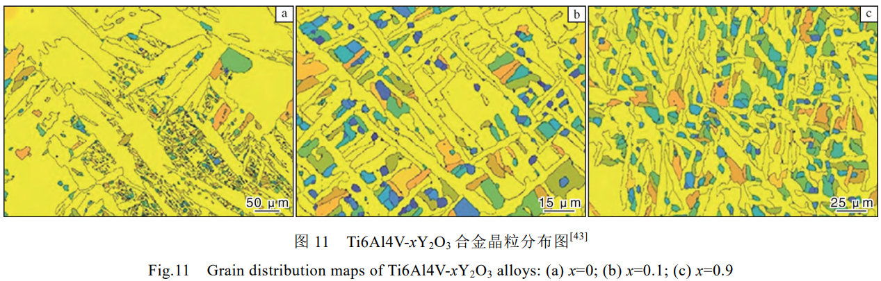 在鈦合金增材制造中,Y2O3顆粒作為成核位點,有助于細化和均勻化組織,從而提升合金的性能。然而,為使合金獲得最佳性能,需要精確控制Y2O3的添加量。過量的Y2O3顆粒可能導致尖端應力集中,增加材料斷裂的風險。南京工業(yè)大學與南京大學、北京航空制造技術(shù)研究院探索了在激光熔化沉積(LMD)Ti6Al4V過程中添加不同含量Y2O3顆粒的效果[43]。圖11為Ti6Al4V-xY2O3合金的晶粒分布圖。研究發(fā)現(xiàn),Ti6Al4V-0.1%Y2O3(質(zhì)量分數(shù),下同)合金的α相尺寸明顯減小,Y2O3作為成核位點促進了α相的等軸化轉(zhuǎn)變,顯著提高了延展性。與Ti6Al4V合金相比,Ti6Al4V-0.1%Y2O3合金的屈服強度和抗拉強度分別提高了7.75%和10.27%,延伸率從5.97%提升至11.53%。此外,Y2O3還顯著改善了材料的摩擦學性能,Ti6Al4V-0.5%Y2O3合金的耐磨性提高了3.6倍。這些研究為提升增材制造Ti6Al4V合金的力學性能提供了新的方法和數(shù)據(jù)支持。