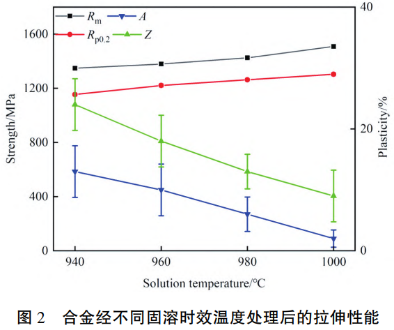 圖2為TC11鈦合金經不同固溶時效溫度處理后的室溫拉伸性能。在時效溫度確定,固溶溫度改變的條件下,合金的強度隨固溶溫度升高而逐漸增加,其抗拉強度Rm由1348MPa升至1509MPa,屈服強度Rp0.2由1154MPa升至1304MPa,塑性則隨固溶溫度的升高而不斷減少,其斷后伸長率A由13%降低2%,斷面收縮率Z由24%降至9%。由圖1可知,固溶溫度升高的過程中,組織中最明顯的變化為初生α相以及次生α相的體積與含量。