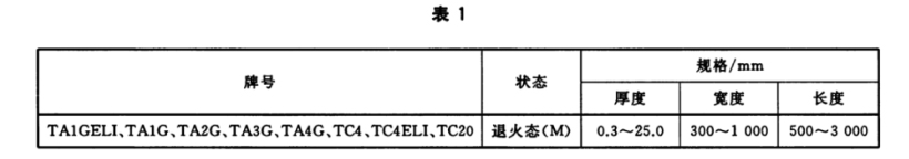 鈦合金板材的牌號、狀態(tài)及規(guī)格應符合表1的規(guī)定。