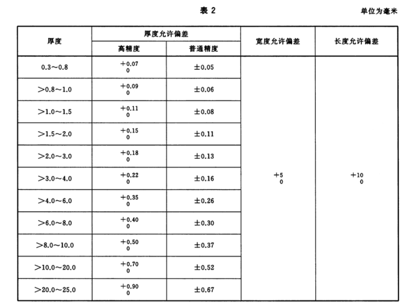 2.1 板材的厚度、寬度、長度允許偏差應符合表2的規(guī)定。